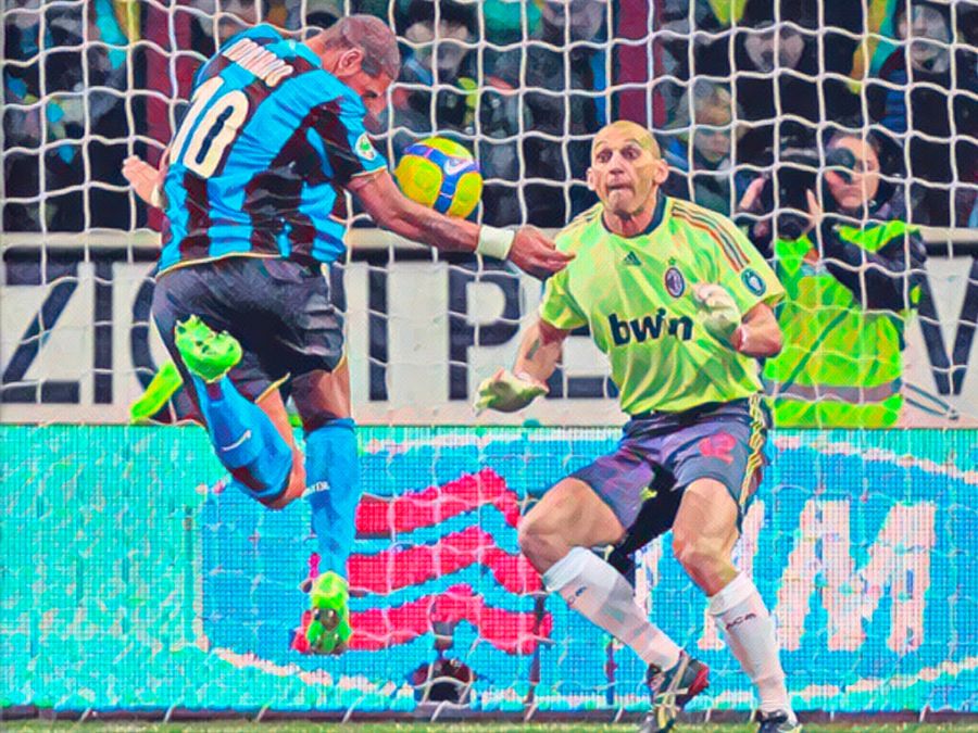 Il momento catartico arriva al 30’ minuto del primo tempo. Maicon scende sulla destra e crossa in area, Maldini è in ritardo, Adriano colpisce male di testa la palla sbatte sul braccio e finisce in gol. E’ una deviazione involontaria ma determinante per la traiettoria della palla. Solo Abbiati protesta. Rosetti convalida.